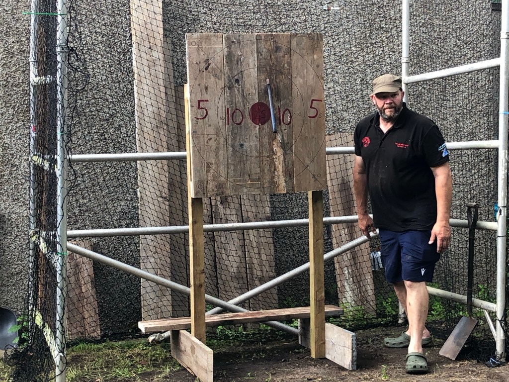 Chris had set up the suitably ārisk assessedā axe throwing – not in the direction of the marquee (oh I didnāt mention the fun that Chris, Rhona and I had putting the marquee up – luckily it wasnāt windy – no one was hurt and we didnāt fall out – it took a wee while but we got there eventually š).