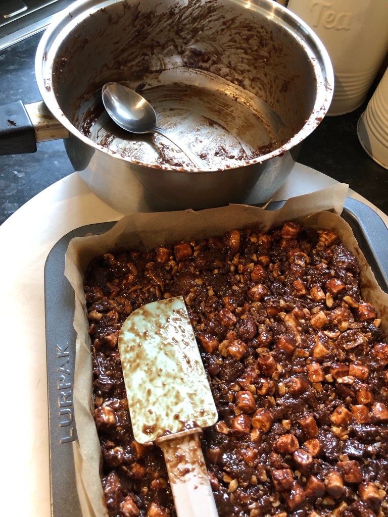 I’ve been making rocky road – it’s more rocky, than road – I just threw in all sorts of random things that I found in the kitchen- nothing too weird, its all sweet 🙂