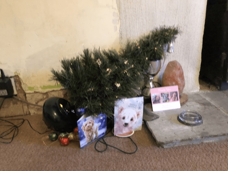 Christmas decorations up = 1, the possessed Christmas tree (it fell over yesterday !!)